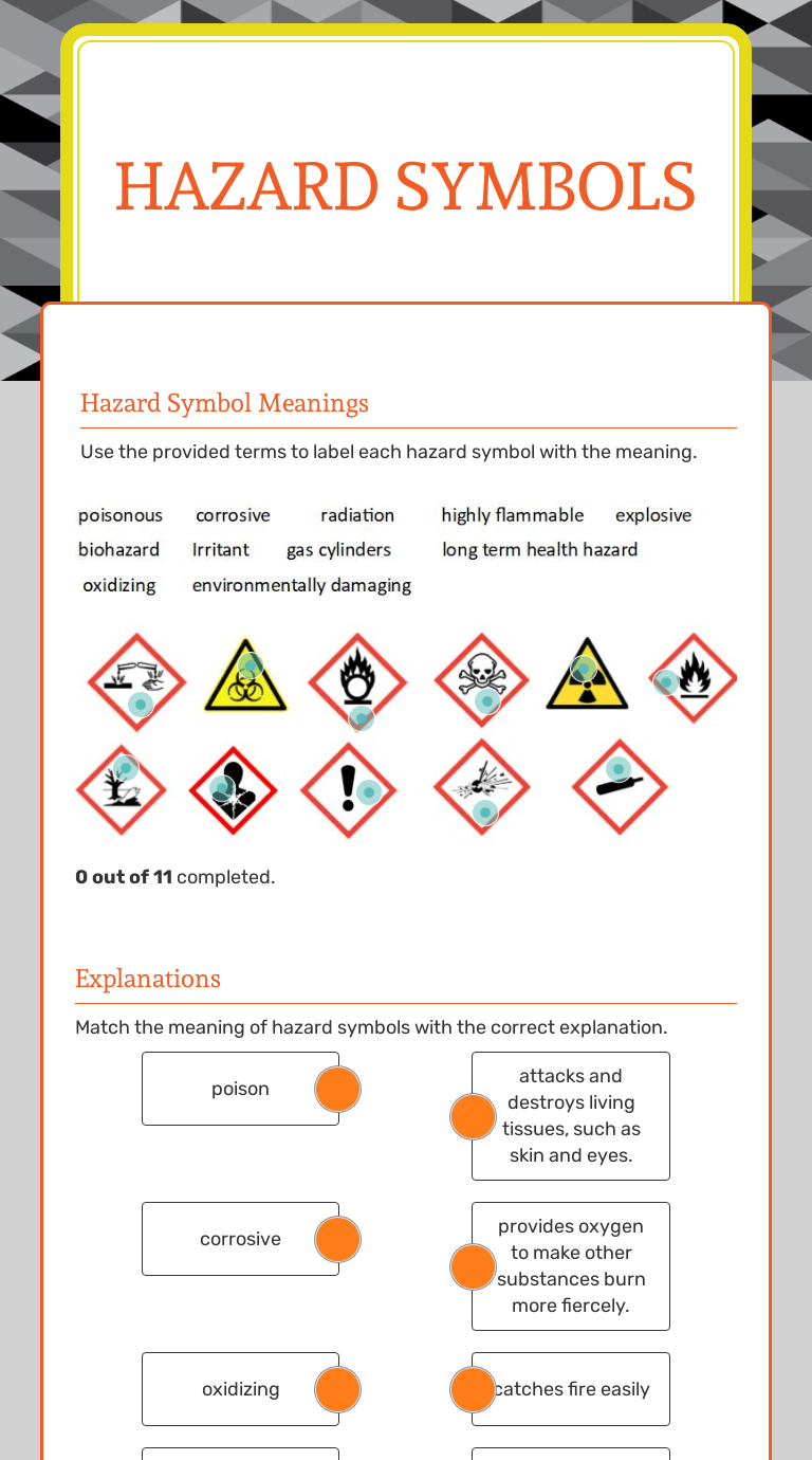 Click here for a worksheet you can print out! All worksheets by subject · arts · early education · english language arts · life skills · math . Safety in the lab worksheet □ □. Learn about and revise hazards and risks with this bbc bitesize gcse chemistry (edexcel) study guide. Then check out some of my free resources! If so then why not purchase some of my other high quality teaching . Special signs warn you about safety hazards. See worksheets, classroom activities and experiments sections of this resource pack. Click here for a worksheet you can print out! Safe science lab safety awareness handouts & reference. In a science lab, this symbol represents. Learn about and revise hazards and risks with this bbc bitesize gcse chemistry (edexcel) study guide. • students may draw hazard symbols in their copies. In this worksheet, we will practice identifying the symbols for hazards and selecting appropriate hazard symbols for common instruments and reagents. Safety in the lab worksheet □ □. All worksheets by subject · arts · early education · english language arts · life skills · math . In this science worksheet, your child learns and identifies what various safety signs mean. From chemical hazard symbols worksheets to hazard symbols worksheet videos, quickly find. Click here for a worksheet you can print out! If so then why not purchase some of my other high quality teaching . Take this fun quiz to see if you can identify common lab safety symbols used to point out hazards in the laboratory. However stronger acids such as hydrochloric acid and alkalis such as sodium hydroxide that are found mostly in science labs, must have a hazard symbol on their . From chemical hazard symbols worksheets to hazard symbols worksheet videos, quickly find. Special signs warn you about safety hazards. See worksheets, classroom activities and experiments sections of this resource pack. If so then why not purchase some of my other high quality teaching . Each chemical has a different hazard. All worksheets by subject · arts · early education · english language arts · life skills · math . In this science worksheet, your child learns and identifies what various safety signs mean. Learn about and revise hazards and risks with this bbc bitesize gcse chemistry (edexcel) study guide. To warn us of the hazards chemicals use hazard symbols. Then check out some of my free resources! From chemical hazard symbols worksheets to hazard symbols worksheet videos, quickly find. However stronger acids such as hydrochloric acid and alkalis such as sodium hydroxide that are found mostly in science labs, must have a hazard symbol on their . Click here for a worksheet you can print out! Are you a science teacher?! • students may draw hazard symbols in their copies. Click here for a worksheet you can print out! In this worksheet, we will practice identifying the symbols for hazards and selecting appropriate hazard symbols for common instruments and reagents. Safety in the lab worksheet □ □. See worksheets, classroom activities and experiments sections of this resource pack. Each chemical has a different hazard. Learn about and revise hazards and risks with this bbc bitesize gcse chemistry (edexcel) study guide. In a science lab, this symbol represents. Safety in the lab worksheet □ □. All worksheets by subject · arts · early education · english language arts · life skills · math . In this worksheet, we will practice identifying the symbols for hazards and selecting appropriate hazard symbols for common instruments and reagents. If so then why not purchase some of my other high quality teaching . However stronger acids such as hydrochloric acid and alkalis such as sodium hydroxide that are found mostly in science labs, must have a hazard symbol on their . • students may draw hazard symbols in their copies. Take this fun quiz to see if you can identify common lab safety symbols used to point out hazards in the laboratory. Then check out some of my free resources! From chemical hazard symbols worksheets to hazard symbols worksheet videos, quickly find. In this science worksheet, your child learns and identifies what various safety signs mean. Hazard Symbols In Science Worksheet / Science Worksheets Hazard Symbols By Science Workshop Tpt -. Are you a science teacher?! Safety in the lab worksheet □ □. Take this fun quiz to see if you can identify common lab safety symbols used to point out hazards in the laboratory. See worksheets, classroom activities and experiments sections of this resource pack. All worksheets by subject · arts · early education · english language arts · life skills · math .